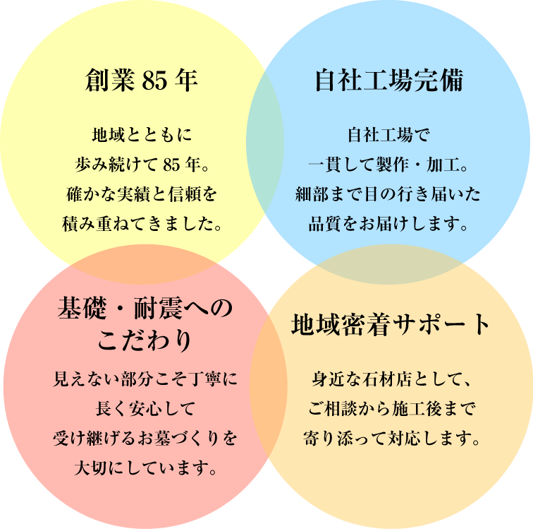 お墓の構造や基礎づくり、石種の選定まで、専門店ならではの視点で丁寧にご案内します。和型・洋型・デザイン墓など、ライフスタイルや想いに寄り添ったご提案が可能です。 お墓作りが初めての方でも、ご相談から設計・施工・完成まで、わかりやすい流れで丁寧にサポートします。専門用語が多くて不安な方にも、安心していただけるQ&Aをまとめています。